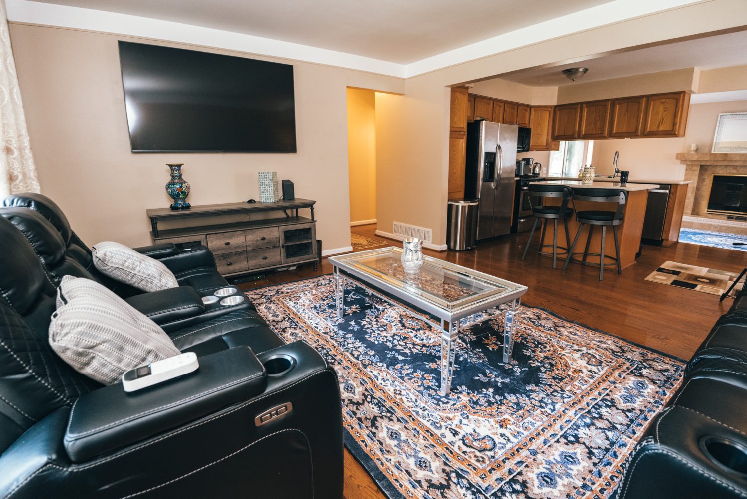Recently updated Fully Furnished Beautiful Brick home with 3 bedrooms 1.5 bathrooms & finished basement. Desirable Canton Subdivision. Wood flooring throughout. In-unit washer and Dryer. Formal living room with 70 "HDTV and upholstered Power Reclining Sofas. Family room is bright and airy with fireplace and sliding glass door which leads to a fenced backyard. Eat in Kitchen with island and round dining table. All cooking essentials, dishwasher, Gas Stove / Oven over-the-range microwave Stainless steel Refrigerator, Keurig Coffee, Latte & Cappuccino Maker.