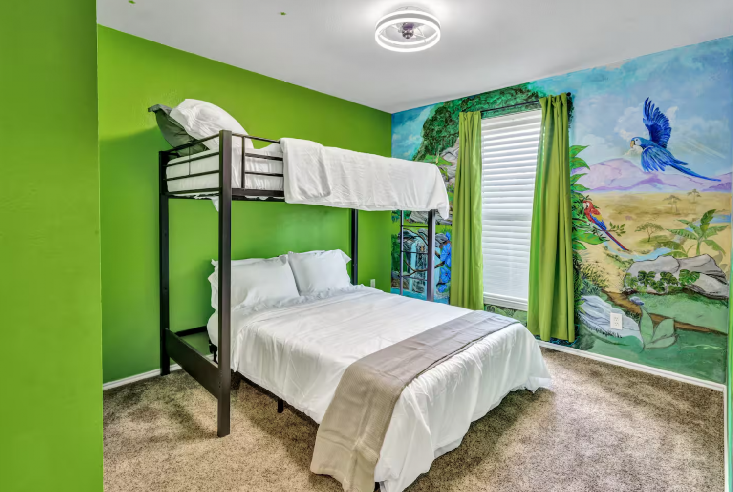 Each of the other bedrooms feature a fun design with loft-style beds, and the 4th bedroom contains a designated workspace that is perfect for students or professionals. A pack ’n play is available in the "horse room".