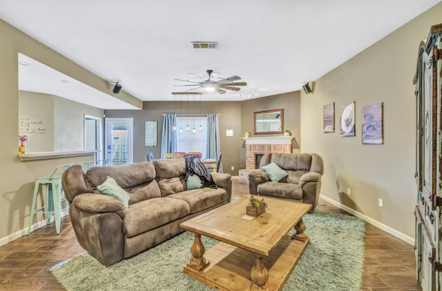 Spacious living room includes a comfy sofa, a cozy wood-burning fireplace, board games, laundry area, and free high-speed WiFi.