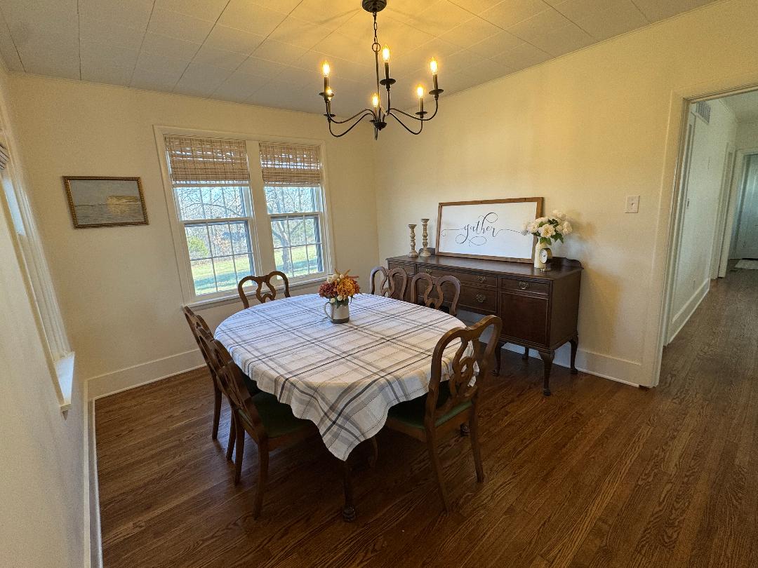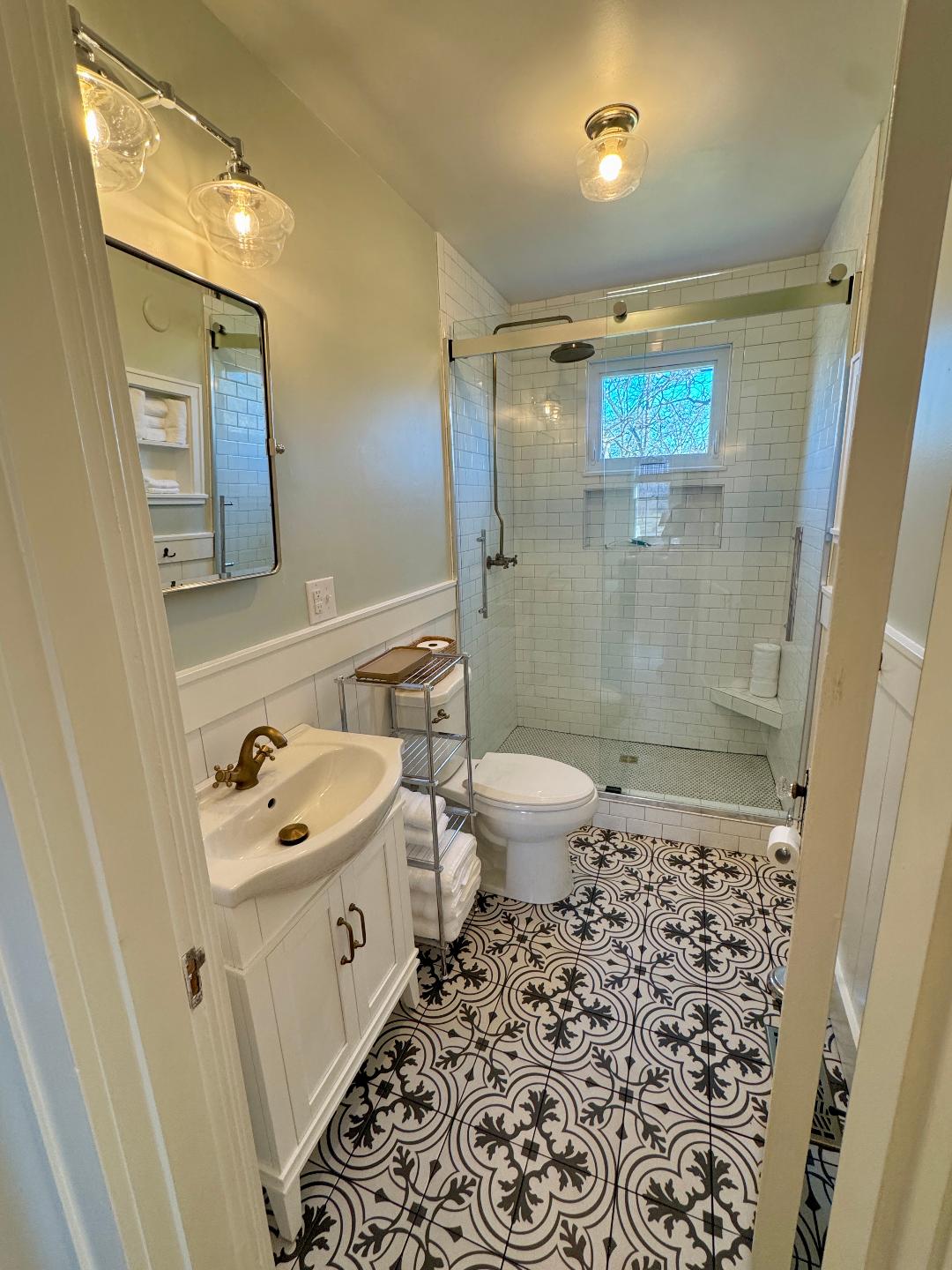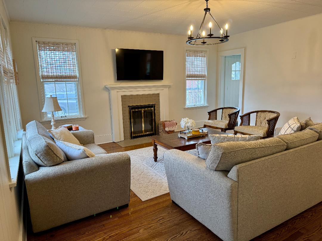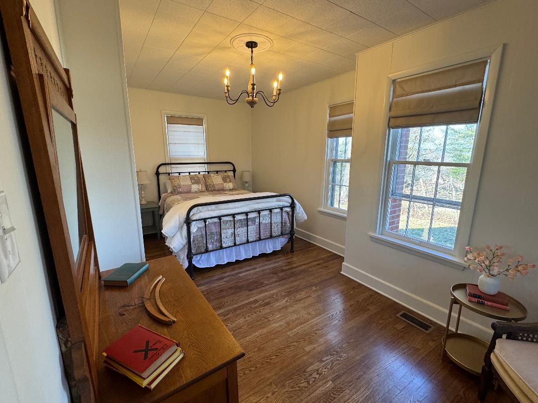 Whispering Hope Farms LLC offers a fully furnished 3 bedroom, 1 bath single family home at 311 Old Highway 100, Washington, MO 63089. The home sits on 2 private acres and has been freshly remodeled with a modern, clean finish. Hardwood floors run throughout. The layout includes a large living room with a flat screen TV, comfortable seating, and plenty of space for a family to settle in. The bathroom is newly remodeled with a walk in shower, rain shower head, and subway tile.