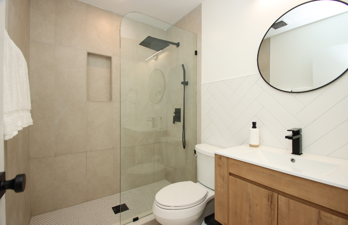 The condo features one cozy bedroom with all the amenities you need for a restful night's sleep, including a luxurious queen-sized bed, a regular closet, two nightstands, a standing mirror, a desk and chair, and a ceiling fan. The bathroom exudes a contemporary style, boasting a beautiful walk-in shower, a single vanity, and a mirror, providing a refreshing sanctuary to indulge in self-care rituals.