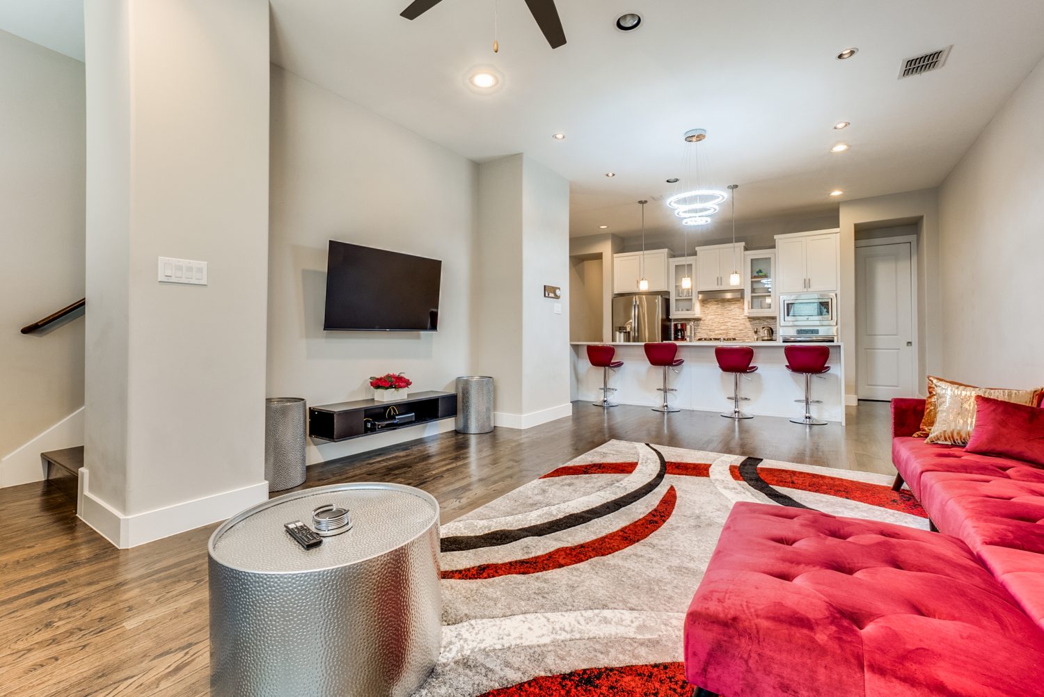 3 story townhome with a full skyline view of Downtown Dallas from the large rooftop terrace for you to lounge in. 2nd floor features a sleek kitchen, complete with a sizable island, stainless steel appliances, a wet bar with built in wine refrigerator.